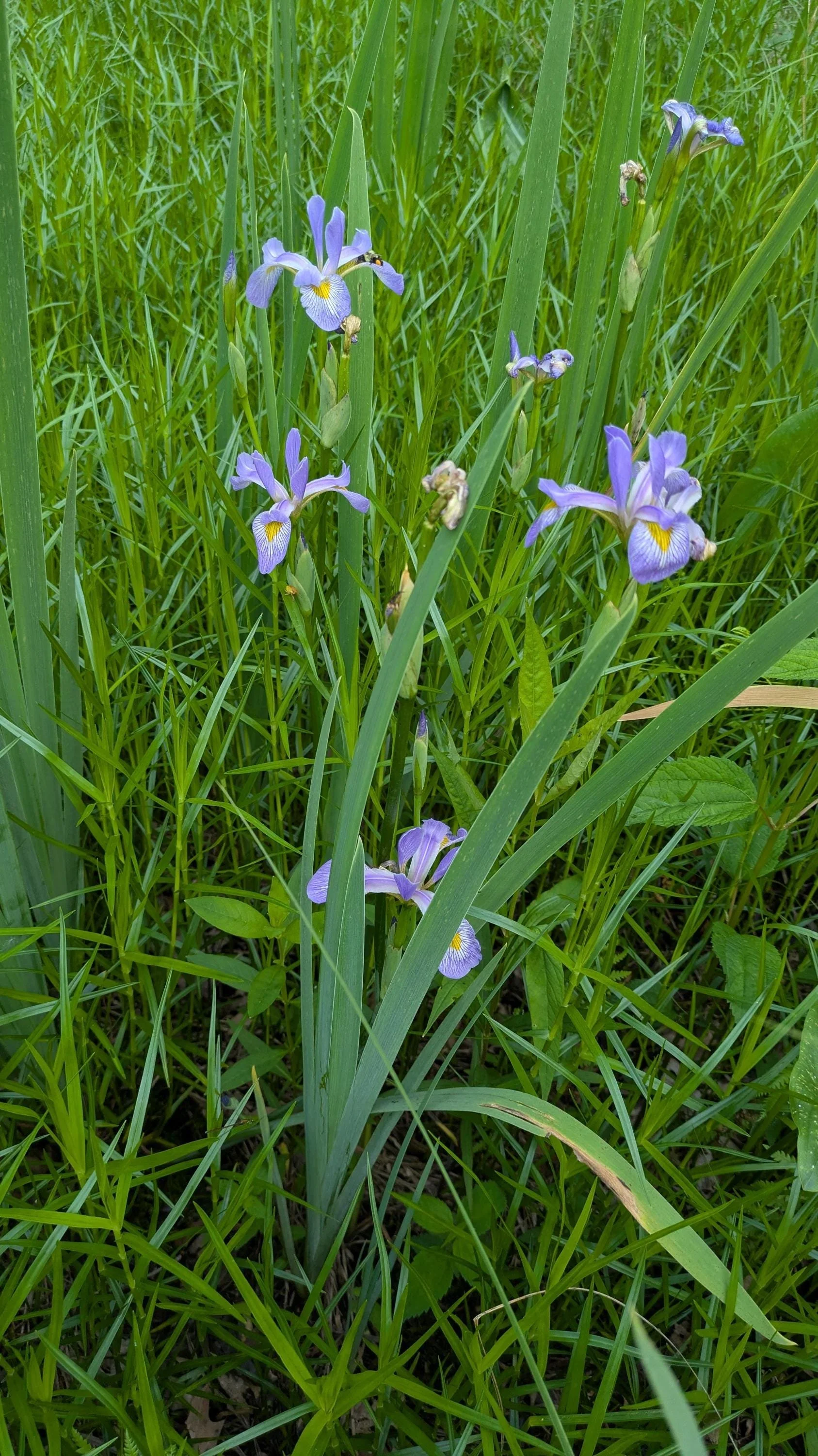 Blue flag iris starter plant (Iris virginica) Native iris usually found on lake, pond, and stream edges. Even though it is found in wetlands in the wild, it will also grow in medium soils that don't dry out. Excellent rain garden plant. Blue/ purple flowers in midsummer with typical iris shape.