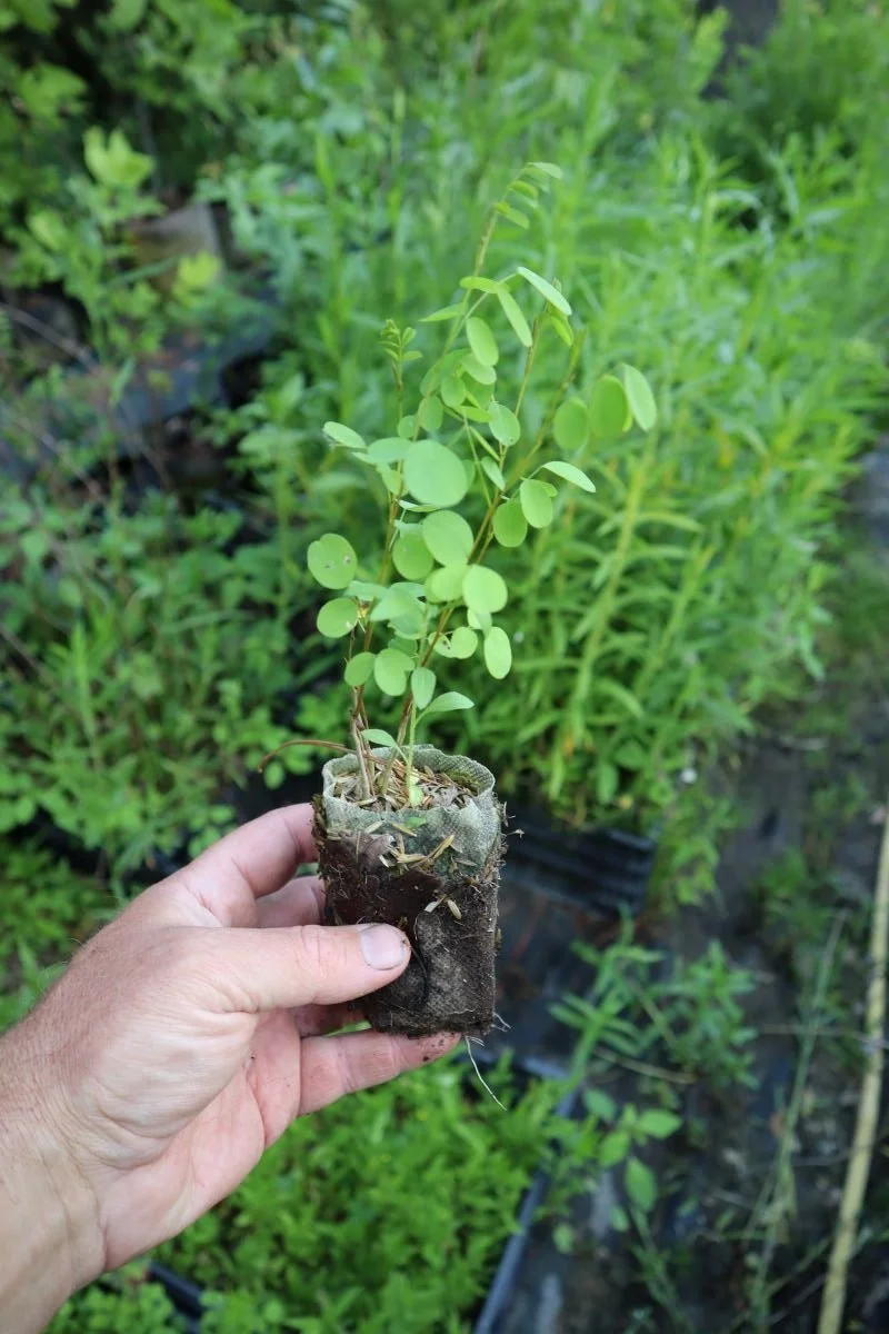 False indigo starter plant (Amorpha fruticosa) A tall (up to 12 ft) thicket forming shrub like plant that likes sunny to partially sunny waters edges, but will tolerate dry periods. Flowers are enjoyed by pollinators and several butterfly species will use as a host plant. Can be an an aggressive spreader. Somewhat similar look to lead plant, but lead plant is slow growing and prefers prairie like environments.