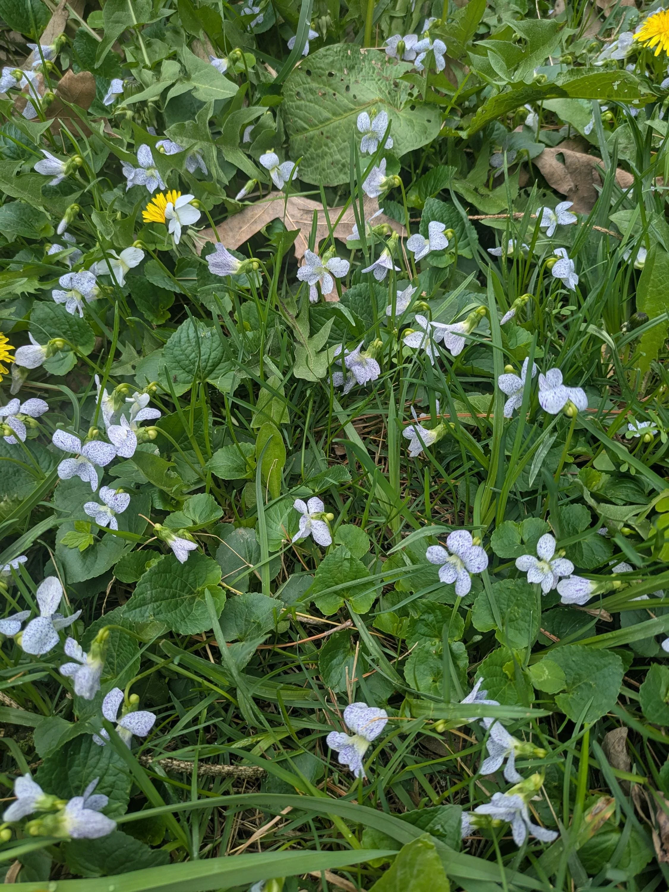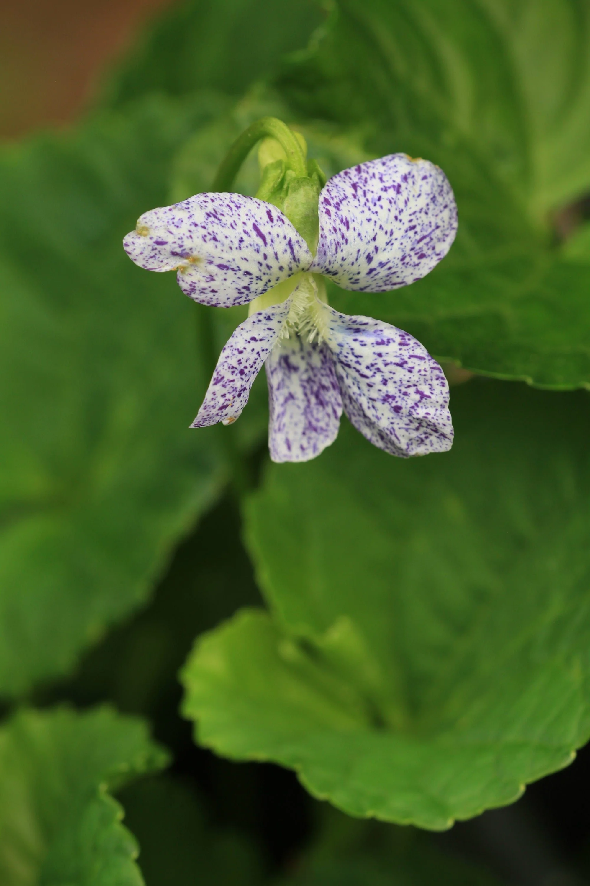 Freckled violet starter plant. Just like the common blue woodland violet, but with white flowers with little purple flecks. 6-8" tall. Flowers in spring. Short plant for shady areas but will grow in sunnier areas too. Host plant for fritillary butterflies!