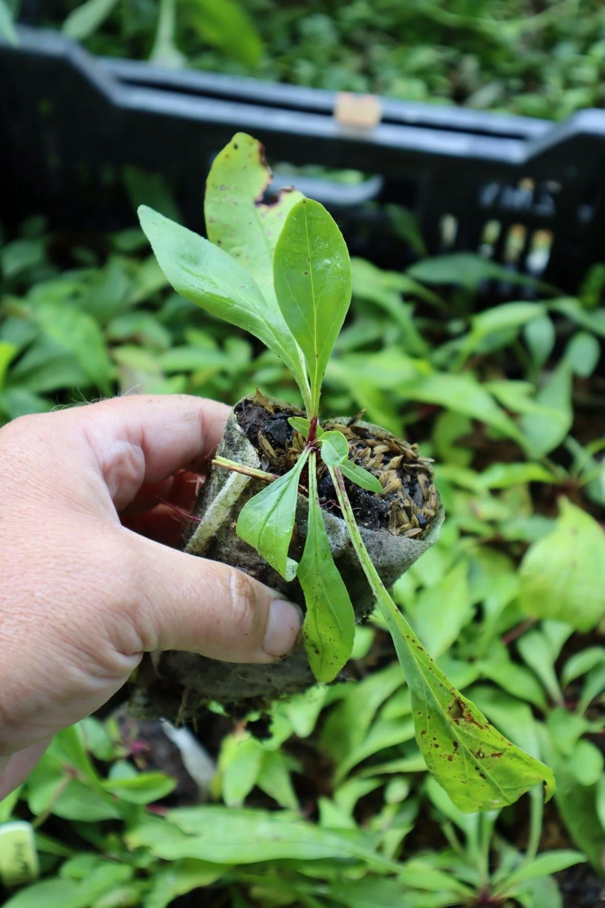 The best place for our plants is in the ground. Do not grow in black plastic nursery pots "till they get bigger" Black plastic pots do not provide good aeration, get very hot, and will cause root circling and poor growth. Although being small, native plants often grow extensive root systems, often more than the visible foliage. When planted in the ground they will have the best chance to work on their roots.