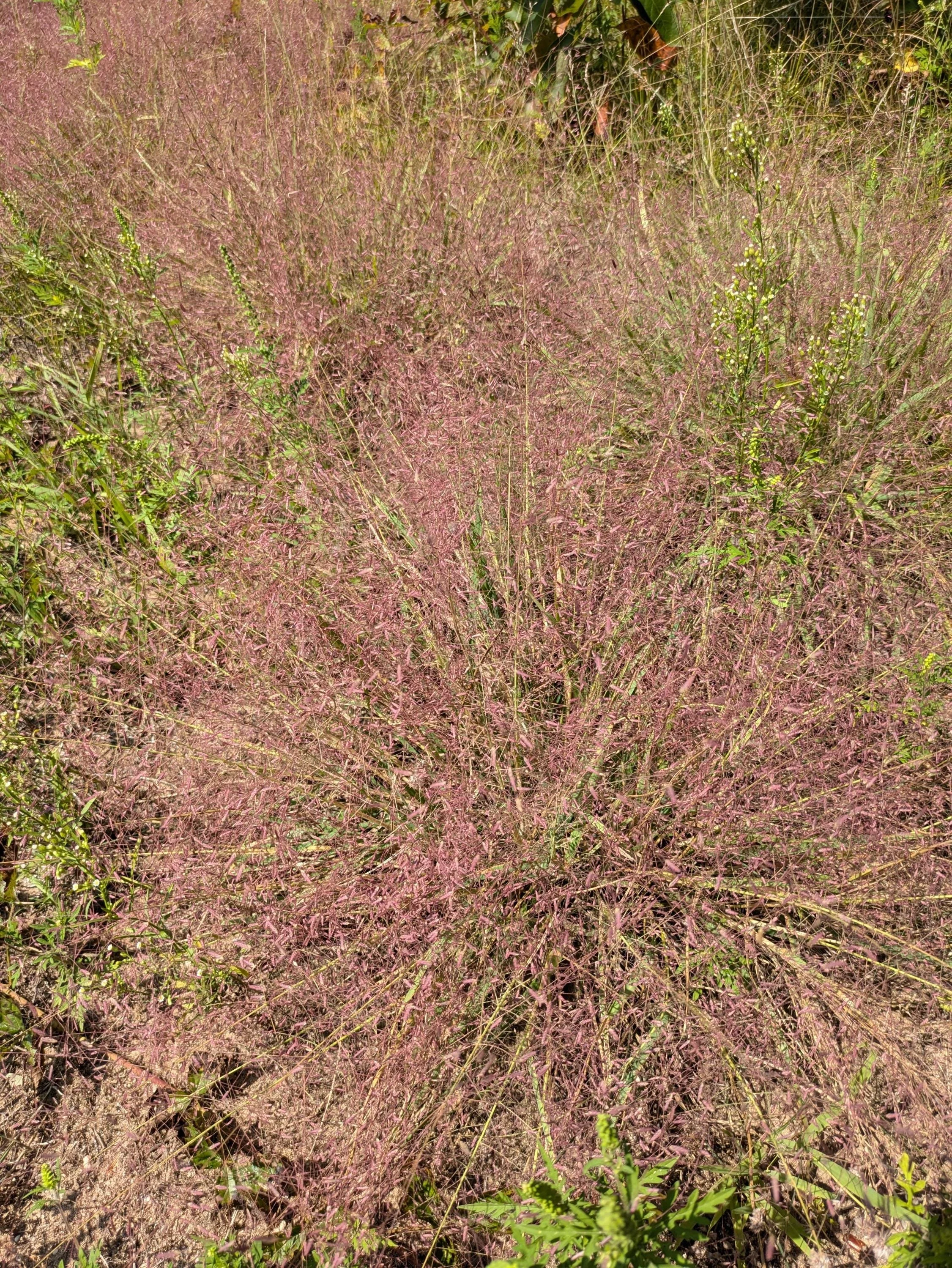 Purple love grass starter plant (Eragrostis spectabilis). Warm season grass for difficult locations. Gets purplish seed heads. 2ft tall. Prefers sunny locations.