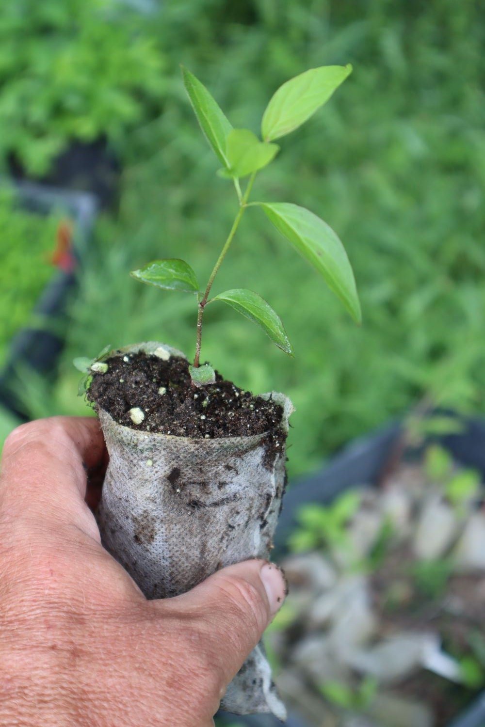 All of our plants are grown in biodegradable fabric pots. The containers are around 4"x4 1/2" Generally, I like to take them off and compost them, but if you leave them on, I like to rip the sides or score them with a knife for easier root penetration.