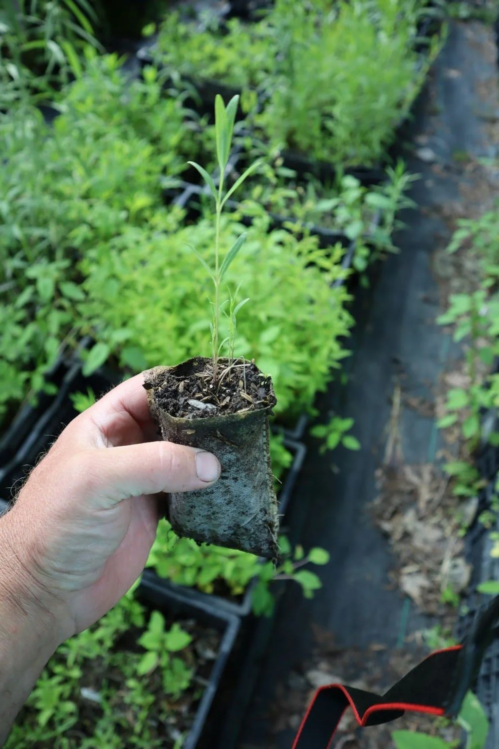 All of our plants are grown in biodegradable fabric pots. The containers are around 4"x4 1/2" May be planted in the pot or removed. If kept on, I suggest ripping the sides of the pot for easier root penetration. Milkweeds are slow growers, so I would tear them off.
